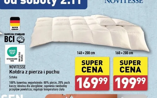 Zastanawiasz si臋, gdzie kupi膰 i ile kosztuje produkt Ko艂dra z pierza i puchu 140 x 200 cm Novitesse? Regularnie sprawdzamy, czy jest promocja na ten produkt w Biedronka, Lidl, Kaufland, Auchan, Netto, Makro i innych sklepach. Aktualnie nie posiadamy ofert promocyjnych na ten produkt.
