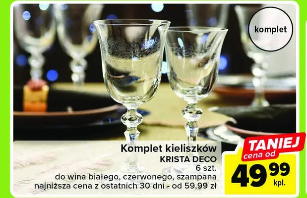Cena produktu r贸偶ni si臋 w zale偶no艣ci od wybranego sklepu. Produkt Komplet kieliszk贸w do szampana krista deco 220 ml mo偶esz kupi膰 w promocji ju偶 od 39,99 z艂. Najta艅sza oferta, jak膮 mamy w naszej bazie jest z sieci Carrefour. Komplet kieliszk贸w do szampana krista deco 220 ml kosztuje aktualnie 39,99 z艂. Zobacz ofert臋