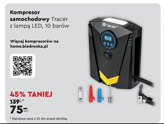 Cena produktu r贸偶ni si臋 w zale偶no艣ci od wybranego sklepu. Niestety nie posiadamy danych o aktualnych promocjach, jednak w艣r贸d archiwalnych ofert Kompresor z lamp膮 led Tracer kosztuje od 75 z艂.