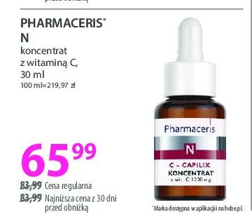 Cena produktu r贸偶ni si臋 w zale偶no艣ci od wybranego sklepu. Niestety nie posiadamy danych o aktualnych promocjach, jednak w艣r贸d archiwalnych ofert Koncentrat z wit. c Pharmaceris n kosztuje od 54,99 z艂 do 65,99 z艂.