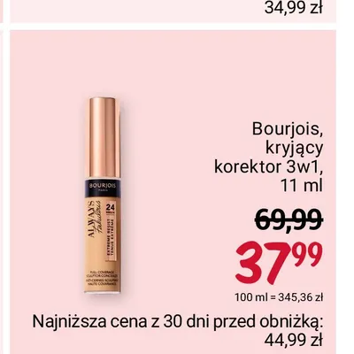 Cena produktu r贸偶ni si臋 w zale偶no艣ci od wybranego sklepu. Niestety nie posiadamy danych o aktualnych promocjach, jednak w艣r贸d archiwalnych ofert Korektor do twarzy 3w1 100 ivory Bourjois always fabulous kosztuje od 34,99 z艂 do 37,99 z艂.