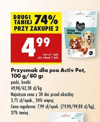 Cena produktu r贸偶ni si臋 w zale偶no艣ci od wybranego sklepu. Niestety nie posiadamy danych o aktualnych promocjach, jednak w艣r贸d archiwalnych ofert Kostki mi臋sne z kurczakiem Activ pet snacks kosztuje od 3,99 z艂 do 4,99 z艂.