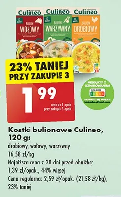 Cena produktu r贸偶ni si臋 w zale偶no艣ci od wybranego sklepu. Niestety nie posiadamy danych o aktualnych promocjach, jednak w艣r贸d archiwalnych ofert Kostki - ros贸艂 drobiowy Culineo kosztuje od 1,69 z艂 do 1,99 z艂.