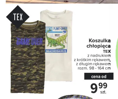 Cena produktu różni się w zależności od wybranego sklepu. Niestety nie posiadamy danych o aktualnych promocjach, jednak wśród archiwalnych ofert Koszula chłopięca z długim rękawem i nadrukiem 98-164 cm Tex kosztuje od 9,99 zł.