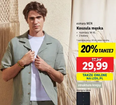 Cena produktu r贸偶ni si臋 w zale偶no艣ci od wybranego sklepu. Produkt Koszula m臋ska Esmara mo偶esz kupi膰 w promocji ju偶 od 69,99 z艂. Najta艅sza oferta, jak膮 mamy w naszej bazie jest z sieci Carrefour. Koszula m臋ska Esmara kosztuje aktualnie 69,99 z艂. Zobacz ofert臋