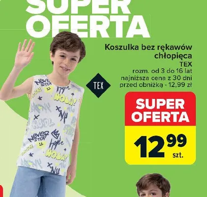 Cena produktu różni się w zależności od wybranego sklepu. Niestety nie posiadamy danych o aktualnych promocjach, jednak wśród archiwalnych ofert Koszulka chłopięca bez rękawów z nadrukiem 98-164 cm Tex kosztuje od 9,99 zł do 14,99 zł.