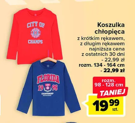Cena produktu różni się w zależności od wybranego sklepu. Niestety nie posiadamy danych o aktualnych promocjach, jednak wśród archiwalnych ofert Koszulka chłopięca z krótkim rękawem 98-128 cm kosztuje od 19,99 zł.