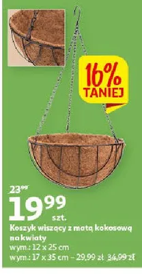 Cena produktu r贸偶ni si臋 w zale偶no艣ci od wybranego sklepu. Niestety nie posiadamy danych o aktualnych promocjach, jednak w艣r贸d archiwalnych ofert Koszyk wisz膮cy z mat膮 kokosow膮 12 x 25 cm kosztuje od 19,99 z艂.