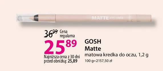 Cena produktu r贸偶ni si臋 w zale偶no艣ci od wybranego sklepu. Niestety nie posiadamy danych o aktualnych promocjach, jednak w艣r贸d archiwalnych ofert Kredka do oczu 013 nude GOSH MATTE EYELINER kosztuje od 25,89 z艂.