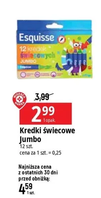 Cena produktu r贸偶ni si臋 w zale偶no艣ci od wybranego sklepu. Niestety nie posiadamy danych o aktualnych promocjach, jednak w艣r贸d archiwalnych ofert Kredki 艣wiecowe jumbo Wiod膮ca marka esquisse kosztuje od 2,99 z艂.