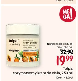 Cena produktu r贸偶ni si臋 w zale偶no艣ci od wybranego sklepu. Niestety nie posiadamy danych o aktualnych promocjach, jednak w艣r贸d archiwalnych ofert Krem do cia艂a enzymatyczny To艂pa dermo body enzyme kosztuje od 19,99 z艂 do 21,99 z艂.