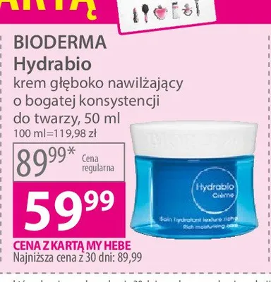 Cena produktu r贸偶ni si臋 w zale偶no艣ci od wybranego sklepu. Niestety nie posiadamy danych o aktualnych promocjach, jednak w艣r贸d archiwalnych ofert Krem do twarzy Bioderma hydrabio creme kosztuje od 54,99 z艂 do 59,99 z艂.