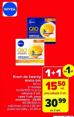 Cena produktu różni się w zależności od wybranego sklepu. Niestety nie posiadamy danych o aktualnych promocjach, jednak wśród archiwalnych ofert Krem do twarzy energetyzujący na dzień odmłodzona i pełna energii cera spf 15 Nivea q10 kosztuje od 15,5 zł do 29,99 zł.