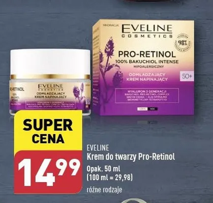 Cena produktu r贸偶ni si臋 w zale偶no艣ci od wybranego sklepu. Niestety nie posiadamy danych o aktualnych promocjach, jednak w艣r贸d archiwalnych ofert Krem do twarzy na dzie艅 i noc 50+ EVELINE PRO-RETINOL kosztuje od 14,99 z艂.