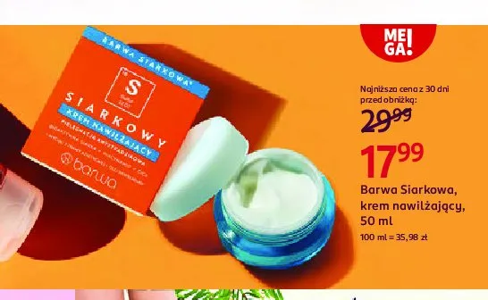 Cena produktu różni się w zależności od wybranego sklepu. Niestety nie posiadamy danych o aktualnych promocjach, jednak wśród archiwalnych ofert Krem do twarzy nawilżający Barwa siarkowa kosztuje od 9,99 zł do 17,99 zł.