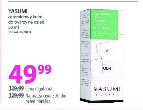 Cena produktu r贸偶ni si臋 w zale偶no艣ci od wybranego sklepu. Niestety nie posiadamy danych o aktualnych promocjach, jednak w艣r贸d archiwalnych ofert Krem do twarzy regeneruj膮cy z ceramidami Yasumi kosztuje od 49,99 z艂.