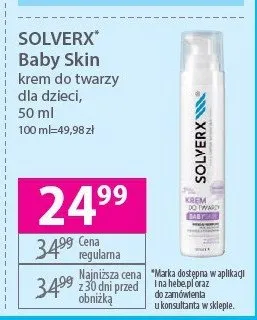 Cena produktu r贸偶ni si臋 w zale偶no艣ci od wybranego sklepu. Niestety nie posiadamy danych o aktualnych promocjach, jednak w艣r贸d archiwalnych ofert Krem do twarzy Solverx baby skin kosztuje od 24,99 z艂.