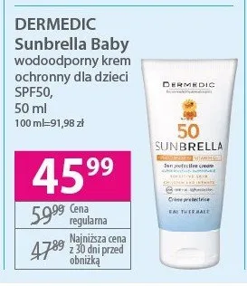 Cena produktu r贸偶ni si臋 w zale偶no艣ci od wybranego sklepu. Niestety nie posiadamy danych o aktualnych promocjach, jednak w艣r贸d archiwalnych ofert Krem do twarzy spf 50+ DERMEDIC BABY SUNBRELLA kosztuje od 45,99 z艂.