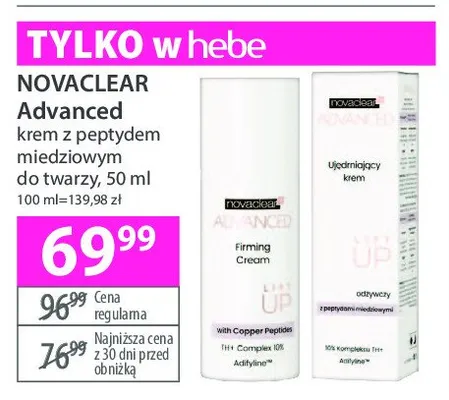 Cena produktu r贸偶ni si臋 w zale偶no艣ci od wybranego sklepu. Niestety nie posiadamy danych o aktualnych promocjach, jednak w艣r贸d archiwalnych ofert Krem do twarzy z peptydem miedziowym Novaclear advanced kosztuje od 69,99 z艂.
