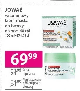 Cena produktu różni się w zależności od wybranego sklepu. Niestety nie posiadamy danych o aktualnych promocjach, jednak wśród archiwalnych ofert Krem-maska na noc nawilżająco-regenerująca Jowae kosztuje od 39,99 zł do 69,99 zł.
