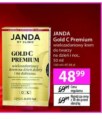 Cena produktu r贸偶ni si臋 w zale偶no艣ci od wybranego sklepu. Niestety nie posiadamy danych o aktualnych promocjach, jednak w艣r贸d archiwalnych ofert Krem na dzie艅 i na dobranoc Janda my clinic gold c premium kosztuje od 48,99 z艂.