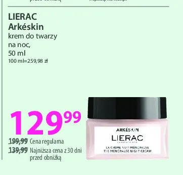 Cena produktu r贸偶ni si臋 w zale偶no艣ci od wybranego sklepu. Niestety nie posiadamy danych o aktualnych promocjach, jednak w艣r贸d archiwalnych ofert Krem na noc LIERAC ARKESKIN kosztuje od 129,99 z艂.