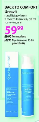 Cena produktu różni się w zależności od wybranego sklepu. Niestety nie posiadamy danych o aktualnych promocjach, jednak wśród archiwalnych ofert Krem nawilżający z mocznikiem 5% BACK TO COMFORT UREAVIT kosztuje od 59,99 zł.