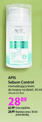 Cena produktu r贸偶ni si臋 w zale偶no艣ci od wybranego sklepu. Niestety nie posiadamy danych o aktualnych promocjach, jednak w艣r贸d archiwalnych ofert Krem normalizuj膮cy na dzie艅 Apis sebum control kosztuje od 28,89 z艂.