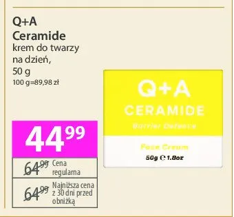 Cena produktu r贸偶ni si臋 w zale偶no艣ci od wybranego sklepu. Niestety nie posiadamy danych o aktualnych promocjach, jednak w艣r贸d archiwalnych ofert Krem ochronny do twarzy Q+a ceramide kosztuje od 44,99 z艂.