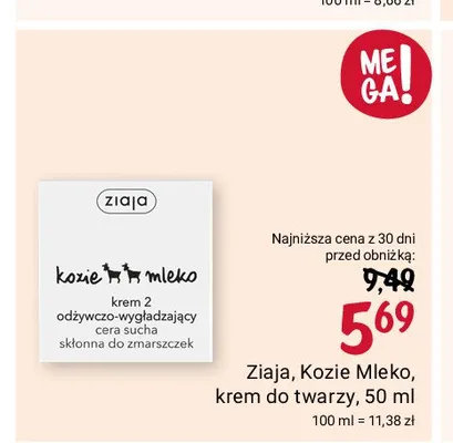 Cena produktu różni się w zależności od wybranego sklepu. Niestety nie posiadamy danych o aktualnych promocjach, jednak wśród archiwalnych ofert Krem odżywczo-wygładzający cera sucha skłonna do zmarszczek Ziaja kozie mleko kosztuje od 5,69 zł do 7,49 zł.