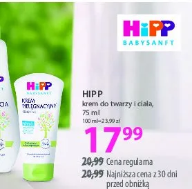 Cena produktu r贸偶ni si臋 w zale偶no艣ci od wybranego sklepu. Niestety nie posiadamy danych o aktualnych promocjach, jednak w艣r贸d archiwalnych ofert Krem piel臋gnacyjny dla dzieci Hipp kosztuje od 17,99 z艂.