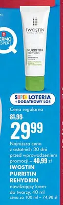 Cena produktu różni się w zależności od wybranego sklepu. Niestety nie posiadamy danych o aktualnych promocjach, jednak wśród archiwalnych ofert Krem przywracający nawilżenie rehydrin Iwostin purritin kosztuje od 29,99 zł do 57,99 zł.