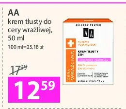 Cena produktu różni się w zależności od wybranego sklepu. Niestety nie posiadamy danych o aktualnych promocjach, jednak wśród archiwalnych ofert Krem tłusty do cery suchej i normalnej Aa technologia wieku cera wrażliwa kosztuje od 12,59 zł.