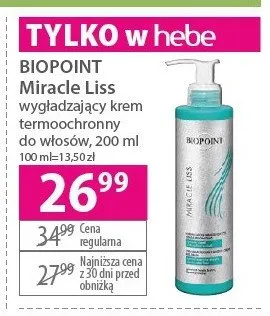 Cena produktu różni się w zależności od wybranego sklepu. Niestety nie posiadamy danych o aktualnych promocjach, jednak wśród archiwalnych ofert Krem wygładzający do włosów BIOPOINT MIRACLE LISS kosztuje od 24,99 zł do 26,99 zł.