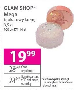 Cena produktu r贸偶ni si臋 w zale偶no艣ci od wybranego sklepu. Niestety nie posiadamy danych o aktualnych promocjach, jednak w艣r贸d archiwalnych ofert Krem z brokatem Glam shop kosztuje od 19,99 z艂.