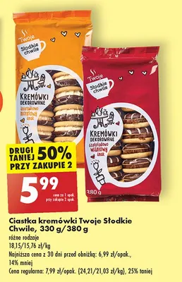 Przeglądaj podobne oferty promocyjne do Kremówki dekorowane czekoladowo-wiśniowe Słodka chwila Słodka (ciastka)!