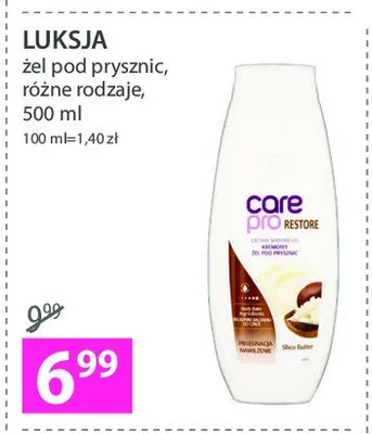 Cena produktu r贸偶ni si臋 w zale偶no艣ci od wybranego sklepu. Niestety nie posiadamy danych o aktualnych promocjach, jednak w艣r贸d archiwalnych ofert Kremowy 偶el pod prysznic restore Luksja care pro kosztuje od 6,99 z艂 do 7,99 z艂.