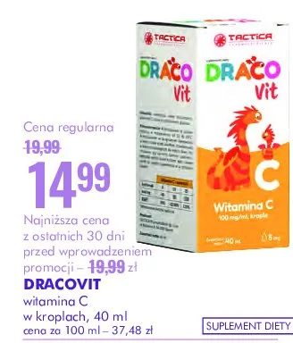 Cena produktu r贸偶ni si臋 w zale偶no艣ci od wybranego sklepu. Niestety nie posiadamy danych o aktualnych promocjach, jednak w艣r贸d archiwalnych ofert Krople witamina c Dracovit kosztuje od 14,99 z艂.