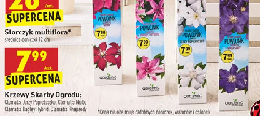 Zastanawiasz si臋, gdzie kupi膰 i ile kosztuje produkt Krzew powojnik clematis hagley hybrid Gardenic? Regularnie sprawdzamy, czy jest promocja na ten produkt w Biedronka, Lidl, Kaufland, Auchan, Netto, Makro i innych sklepach. Aktualnie nie posiadamy ofert promocyjnych na ten produkt.