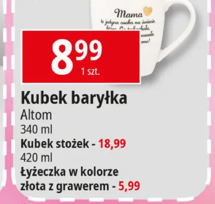 Cena produktu r贸偶ni si臋 w zale偶no艣ci od wybranego sklepu i obowi膮zuj膮cych promocji. Aktualnie w naszej bazie nie mamy informacji o cenach produktu Kubek bary艂ka poj. 340 ml Altom.