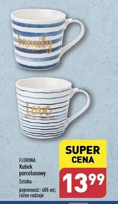 Cena produktu r贸偶ni si臋 w zale偶no艣ci od wybranego sklepu. Niestety nie posiadamy danych o aktualnych promocjach, jednak w艣r贸d archiwalnych ofert Kubek porcelanowy 400 ml Florina (florentyna) kosztuje od 12,99 z艂 do 13,99 z艂.