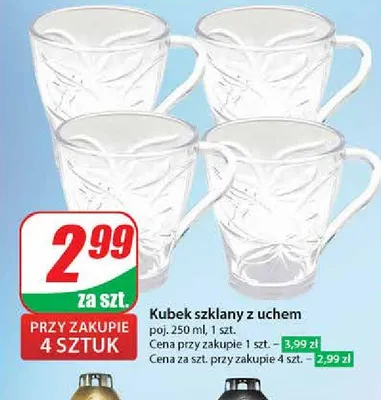 Cena produktu r贸偶ni si臋 w zale偶no艣ci od wybranego sklepu. Niestety nie posiadamy danych o aktualnych promocjach, jednak w艣r贸d archiwalnych ofert Kubek szklany z uchem 250 ml Glasmark kosztuje od 2,99 z艂.