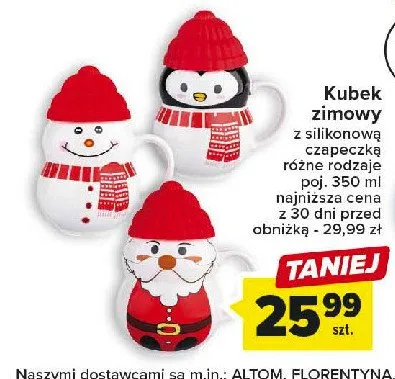 Cena produktu r贸偶ni si臋 w zale偶no艣ci od wybranego sklepu. Produkt Kubek z silikonow膮 czapeczk膮 350 ml mo偶esz kupi膰 w promocji ju偶 od 49,99 z艂. Najta艅sza oferta, jak膮 mamy w naszej bazie jest z sieci Carrefour. Kubek z silikonow膮 czapeczk膮 350 ml kosztuje aktualnie 49,99 z艂. Zobacz ofert臋
