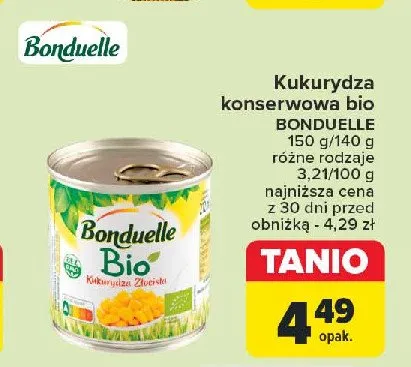 Cena produktu r贸偶ni si臋 w zale偶no艣ci od wybranego sklepu. Niestety nie posiadamy danych o aktualnych promocjach, jednak w艣r贸d archiwalnych ofert Kukurydza z艂ocista Bonduelle bio kosztuje od 4,19 z艂 do 4,49 z艂.
