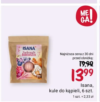 Cena produktu r贸偶ni si臋 w zale偶no艣ci od wybranego sklepu. Niestety nie posiadamy danych o aktualnych promocjach, jednak w艣r贸d archiwalnych ofert Kule do k膮pieli blueberry apple pumpkin Isana kosztuje od 13,29 z艂 do 14,79 z艂.