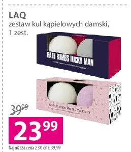 Cena produktu r贸偶ni si臋 w zale偶no艣ci od wybranego sklepu. Produkt Kule do k膮pieli Laq mo偶esz kupi膰 w promocji ju偶 od 3 z艂 do 9,99 z艂. Najta艅sza oferta, jak膮 mamy w naszej bazie jest z sieci Drogerie Natura. Kule do k膮pieli Laq kosztuje aktualnie 3 z艂. Zobacz ofert臋