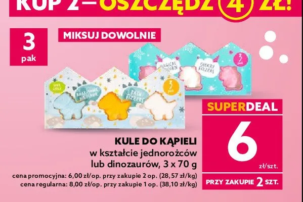 Cena produktu różni się w zależności od wybranego sklepu. Niestety nie posiadamy danych o aktualnych promocjach, jednak wśród archiwalnych ofert Kule do kąpieli w kształcie jednorożców kosztuje od 6 zł.