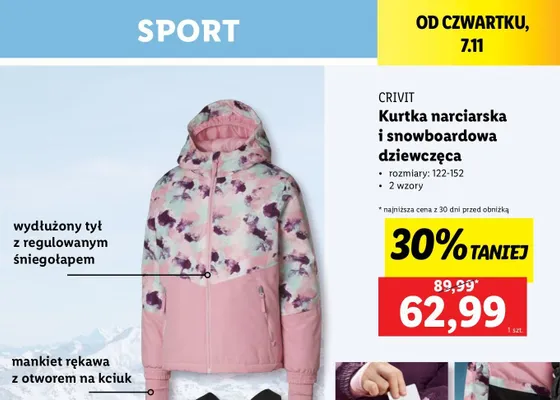 Cena produktu różni się w zależności od wybranego sklepu. Niestety nie posiadamy danych o aktualnych promocjach, jednak wśród archiwalnych ofert Kurtka narciarska młodzieżowa 122-152 Crivit kosztuje od 62,99 zł.