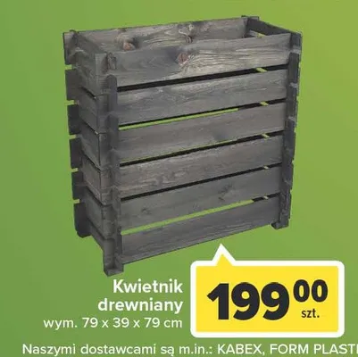 Cena produktu r贸偶ni si臋 w zale偶no艣ci od wybranego sklepu. Niestety nie posiadamy danych o aktualnych promocjach, jednak w艣r贸d archiwalnych ofert Kwietnik drewniany 79 x 39 x 79 cm kosztuje od 199 z艂.