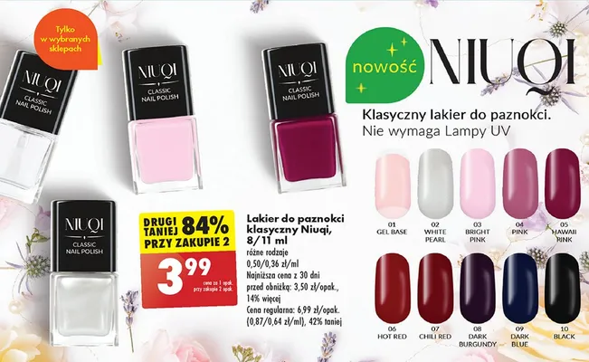 Cena produktu r贸偶ni si臋 w zale偶no艣ci od wybranego sklepu. Niestety nie posiadamy danych o aktualnych promocjach, jednak w艣r贸d archiwalnych ofert Lakier 06 red hot Niuqi kosztuje od 3,99 z艂.